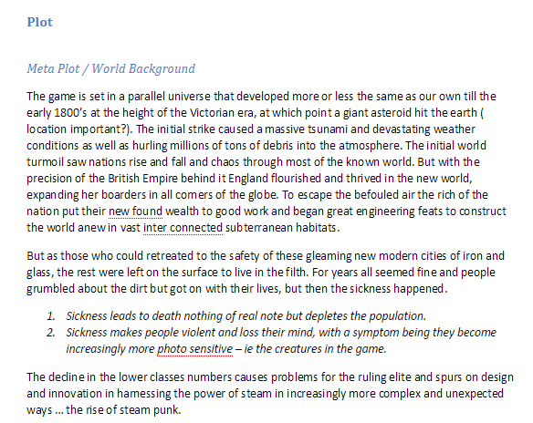 screenshot of design document outlining the plot, narrative and backstory of the game.